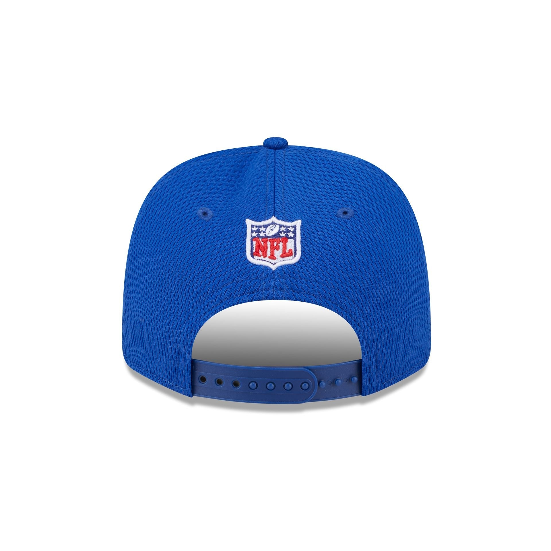 The New York Giants 2024 Sideline 9SEVENTY Stretch-Snap Hat features an embroidered Giants logo at the front panels with a matching rope at the base of the crown. Additional details include a Conference patch at the right-wear side and an NFL Shield above a snapback closure at the rear.
